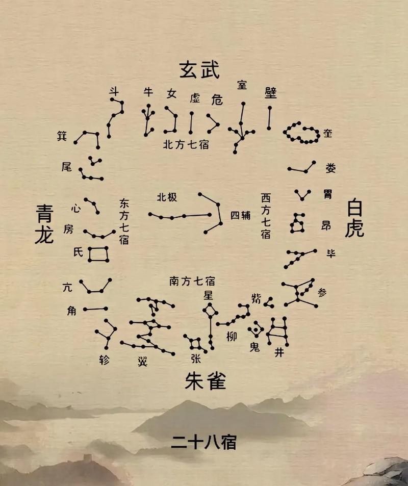 我国古代天文学家将黄赤道附近的星象划分为二十八宿,又按东南西北四个方位分为四组,产生“四象”:东方苍龙、西方白虎、南方朱雀、北方玄武。其中,东方七宿——角、亢、氐、房、心、尾、箕,连起来形似一条巨龙,古人称之为“苍龙”。