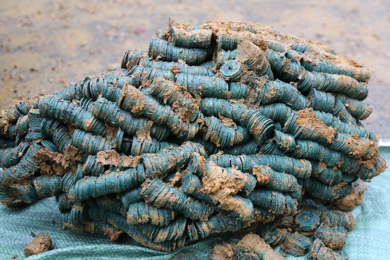 近日,湖南邵阳武冈施工过程中发现大量古钱币。据介绍,这批古钱币经预估约3吨(含水和泥土),涵盖唐、北宋、南宋、金等多个时期,通过调查勘探确认是一处大型古钱币窖藏。这是目前为止邵阳地区发现的规模最大的古钱币窖藏,对研究武冈历史以及古代经贸史具有重要研究价值。