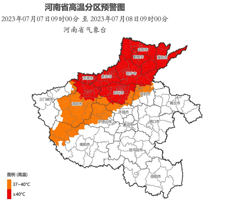 河南省气象台7月7日9时升级发布高温红色预警:预计7月7日白天,黄河以北和郑州、开封西北部、洛阳北部部分县市最高气温将升至40℃以上。