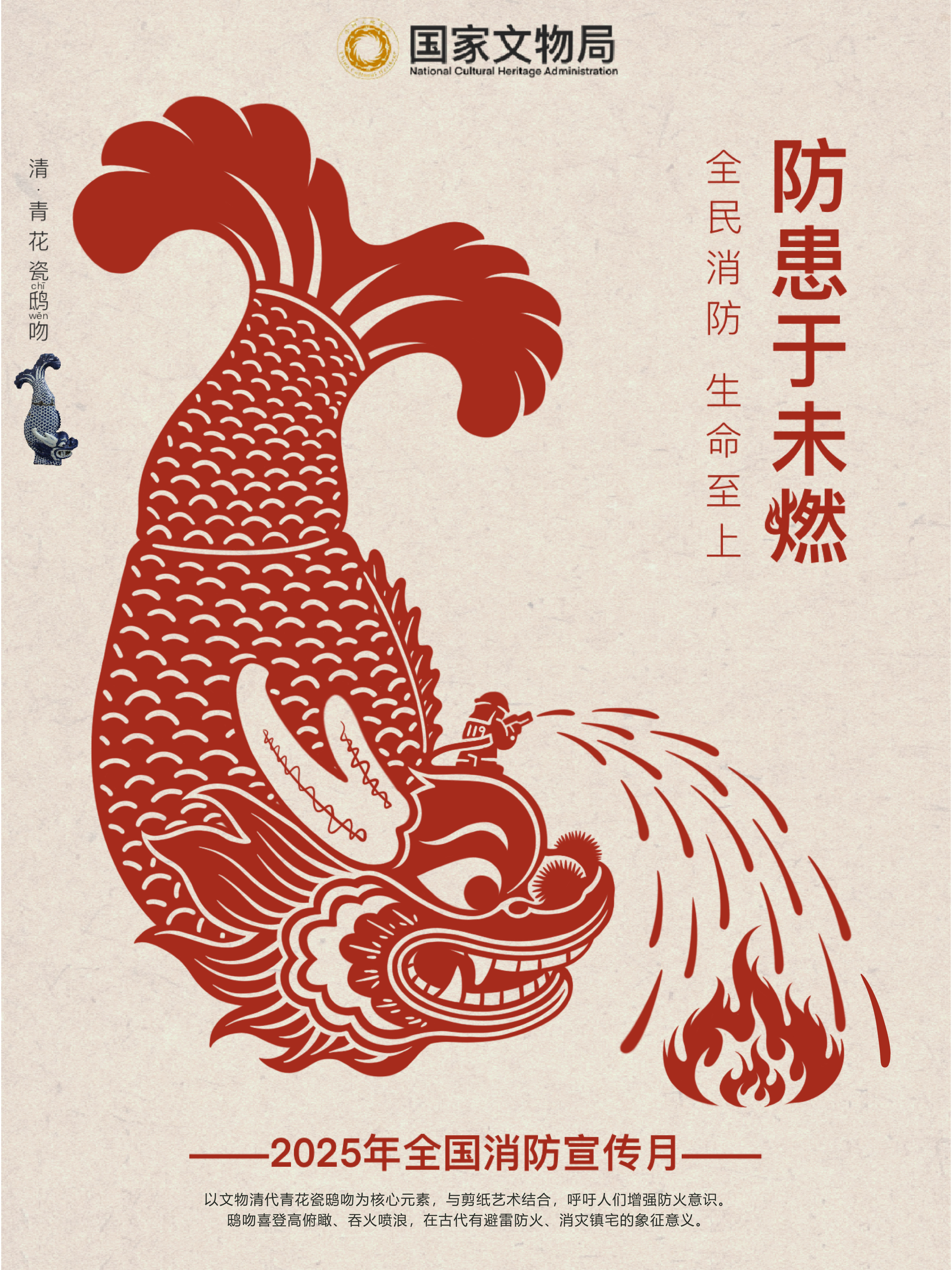 作品简介:海报以江西省博物馆馆藏文物——“清代青花瓷鸱吻”为核心元素,鸱吻是传说中龙的第九子,喜登高俯瞰,吞火喷浪。古代有避雷防火、消灾镇宅的象征意义。同时,海报巧妙地以国家级非物质文化遗产——瑞昌剪纸的艺术形式将文物鸱吻与消防队员灭火的场景结合,呼吁人们珍视历史文化遗产,增强防火意识,共同守护文物安全。