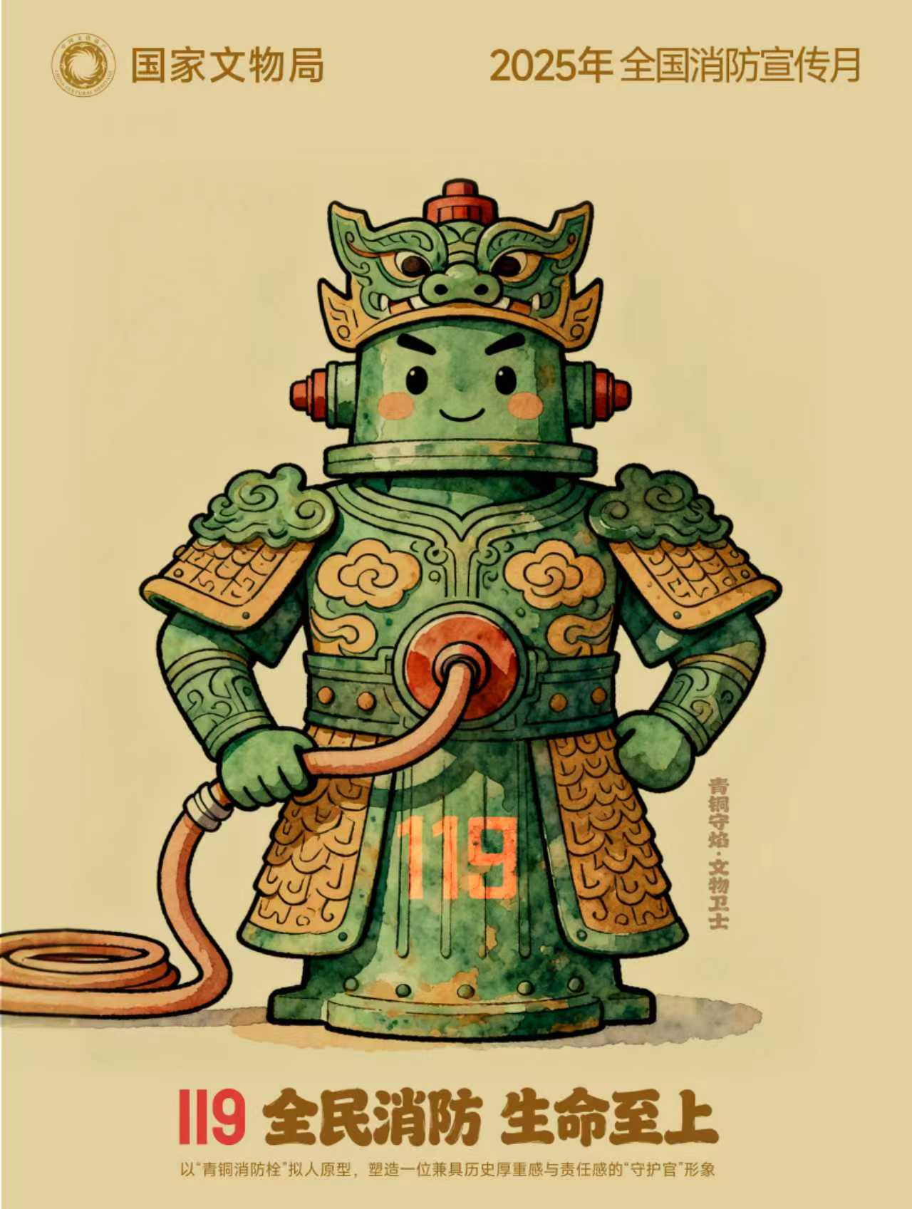 作品简介:以“青铜消防栓”拟人原型,塑造一位兼具历史厚重感与责任感的“文物卫士”形象。主体保留青铜材质的斑驳质感,表面錾刻云雷纹、夔龙纹等传统纹饰,呼应文物古韵;头部轮廓圆润,眉眼目光如炬,嘴角带温和而坚定的笑意,传递“守护”的亲和力与坚定感。整体姿态挺拔如青铜礼器,暗喻“守护文物”的核心使命。设计通过“古器拟人+功能转译”,将消防安全的现代需求与传统文物的历史记忆交织,传递“每一件青铜器都是沉默的文明见证,而我们,是它醒着的守护者”的深层寓意。
