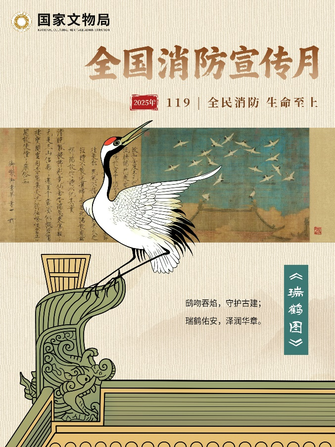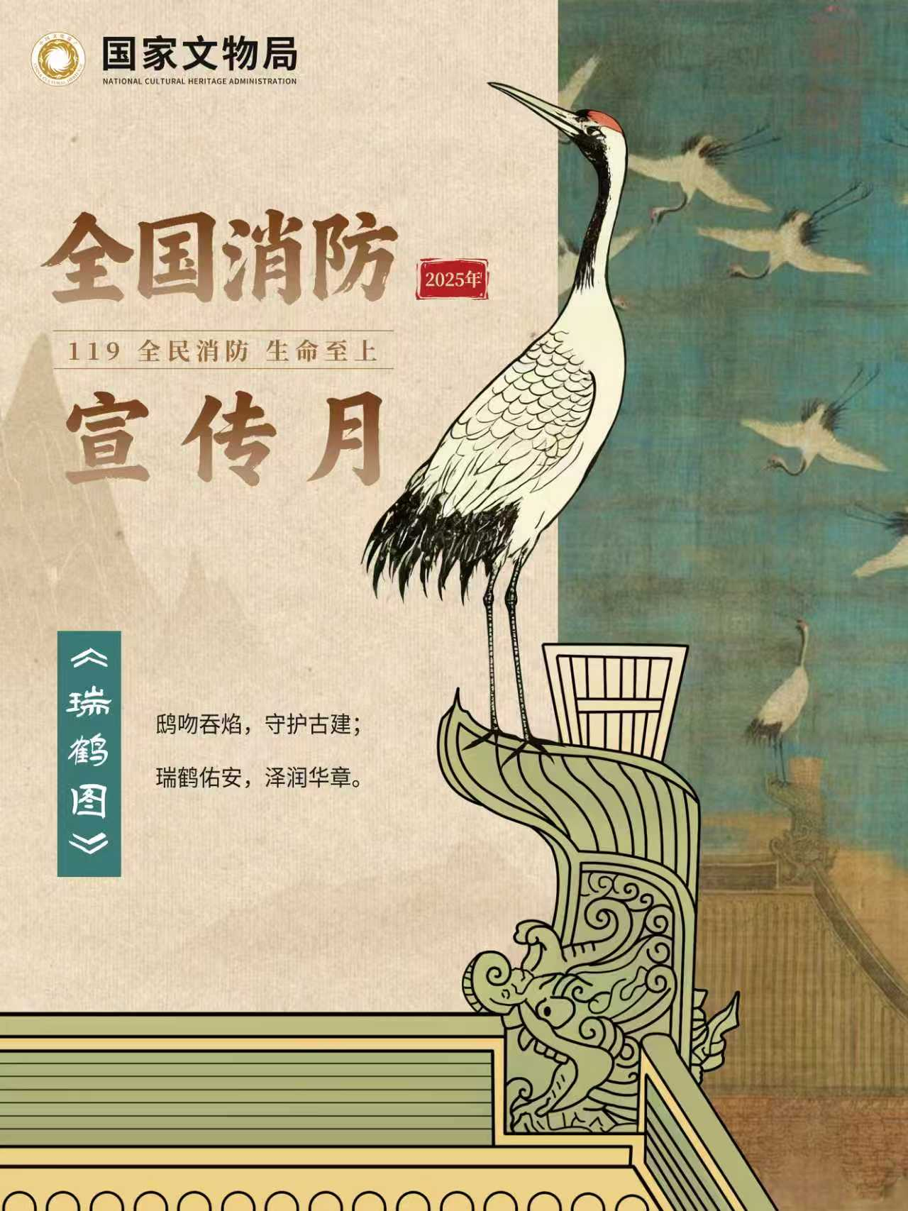 作品简介:海报以辽宁省博物馆馆藏文物《瑞鹤图》中的鸱吻与白鹤为核心元素,鸱吻作为中国古代建筑正脊两端的“避火兽”,其怒目张口吞住正脊的造型,暗含着“以龙镇火、喷水消灾”的古老智慧,是中华文明消防安全意识的早期具象化表达;鸱吻之上,两只白鹤翩然伫立,于庄严肃穆间晕染出吉祥平安的祥瑞之气。
