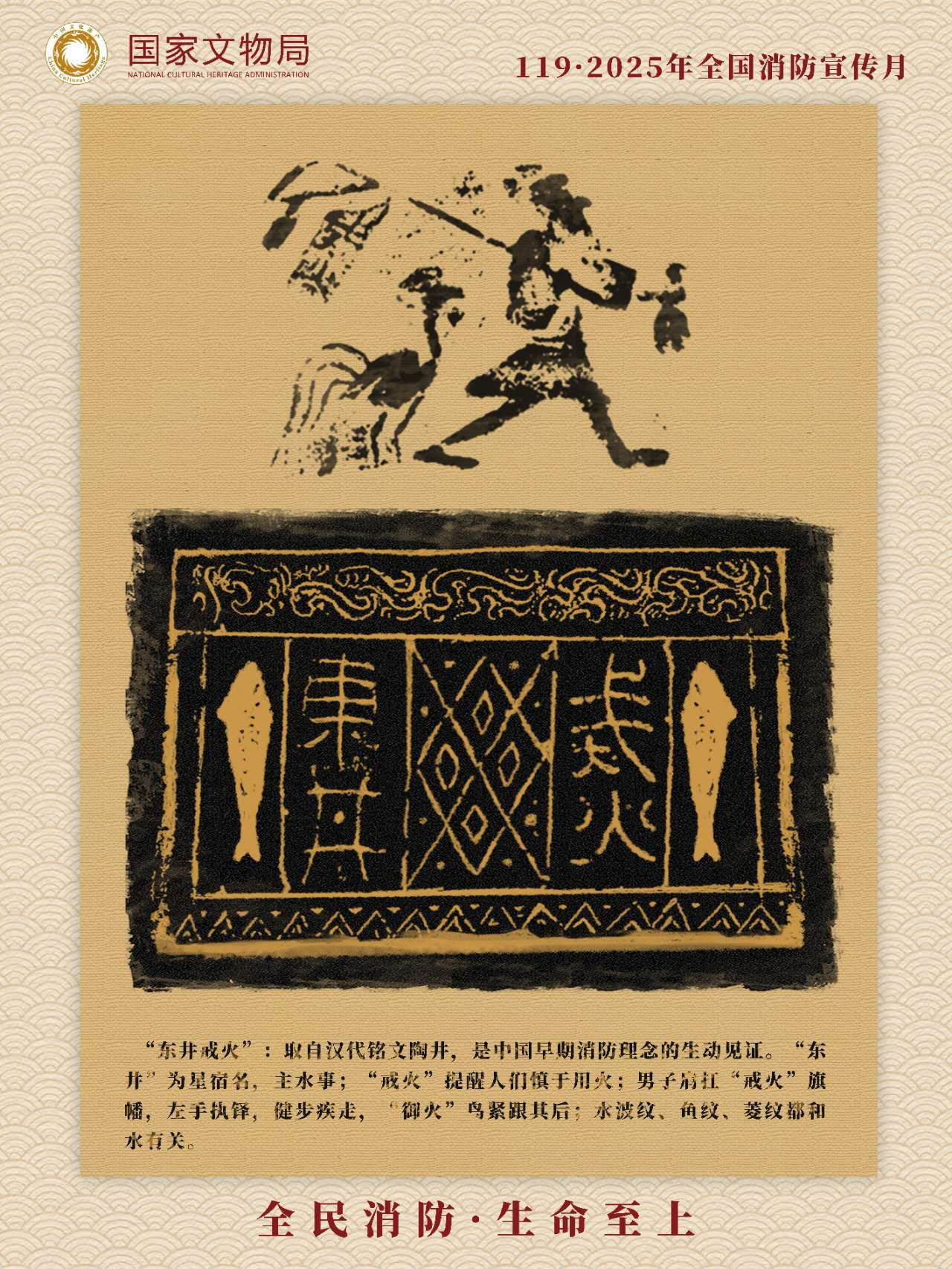作品简介:铭文中的“东井”为星宿名,主水事,体现了古人希望借其文化内涵来防范火灾的愿望。“戒火”两个字提醒人们要谨慎用火,说明古人“防患于未然”的消防安全意识。水波纹、鱼纹、菱纹也都和水有关,说明了古人对希望不要发生火灾的美好愿望。“东井戒火”汉代铭文陶井可以说是2000年前的消防专用井,包含了古人藏在汉代陶井里的千年消防智慧。