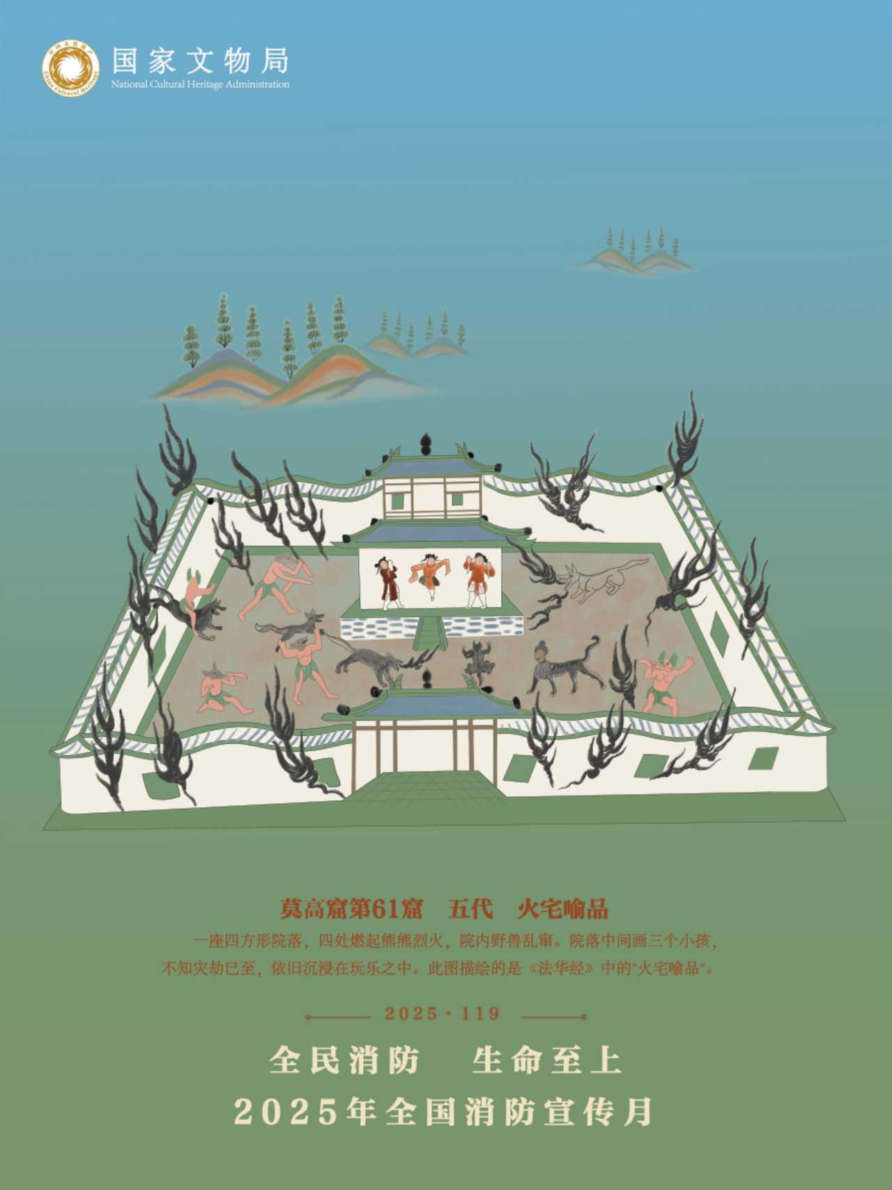作品简介:本海报创意源于敦煌莫高窟第61窟《法华经·火宅喻品》,以跨越千年的古人智慧,发出文物消防的现代警示。通过恢弘的构图与紧张的叙事张力,让观者直面“火患”的恐怖。千年壁画中的场景,正是今日文物古建消防工作的生动写照,文物如孩童,身处脆弱之“宅”。“古今对话”,深刻揭示文物安全面临的威胁,彰显守护文明的使命。