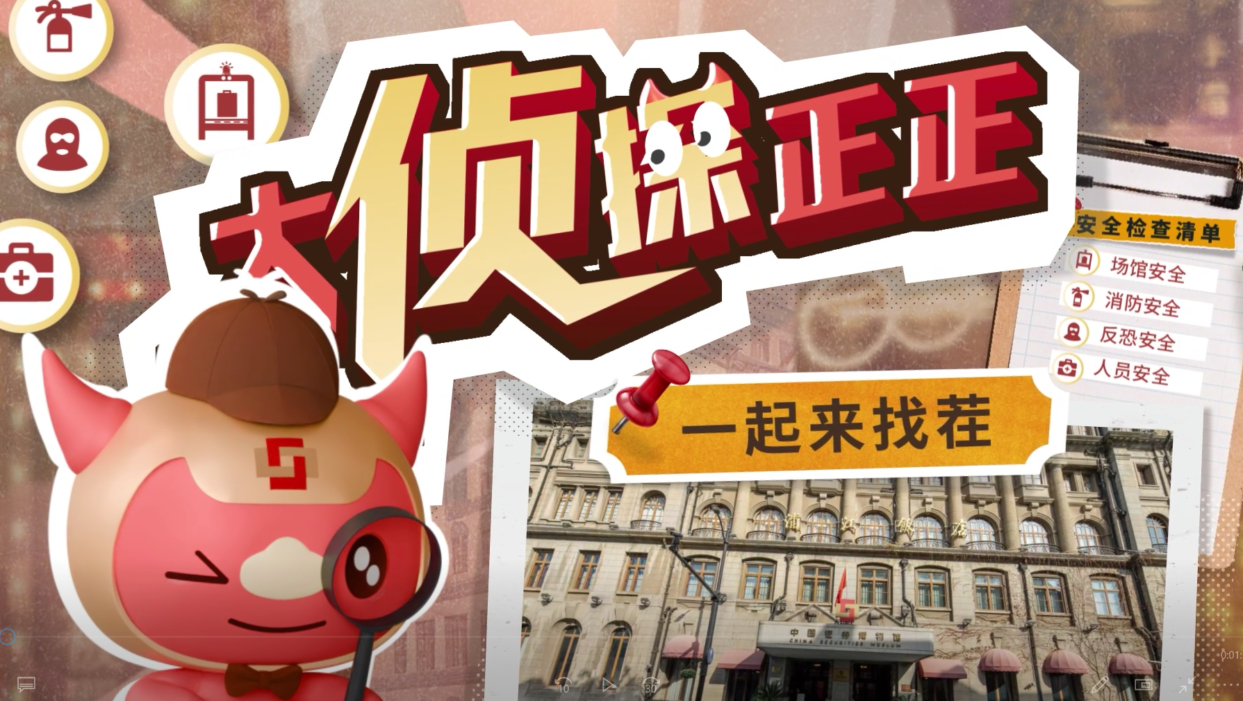 作品简介:该视频作品中吉祥物正正摇身一变成为一名安全员,按照收到的一张安全检查单,带领观众走进中国证券博物馆,以侦探之名,来一场充满挑战与惊喜的奇幻之旅。该作品短小精悍、生动形象,以拟人化的动画呈现和实景拍摄相结合,通过场馆安全、消防安全、反恐安全和人员意外安全四个方面的系统排查,展现了作为优秀历史保护建筑的中证博是如何齐抓共管,守牢文物安全底线,为广大观众营造一个安全、舒适、和谐的参观环境。