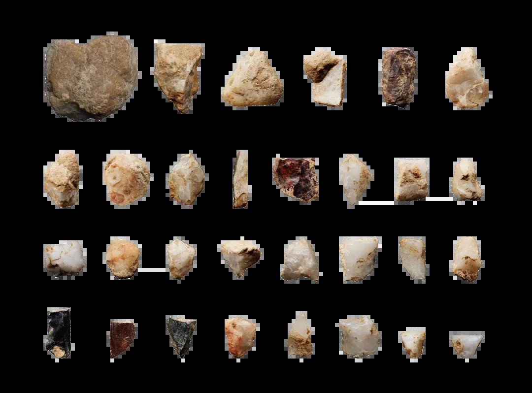 石料利用方面,早段以脉石英为主,中、晚段以脉石英和燧石为主,另见少量赤铁矿、灰岩和砂岩等。石制品以石片和碎屑数量最多,工具组合中刮削器占主导。自中段开始出现预制细石核,石器加工技术发生显著变化。