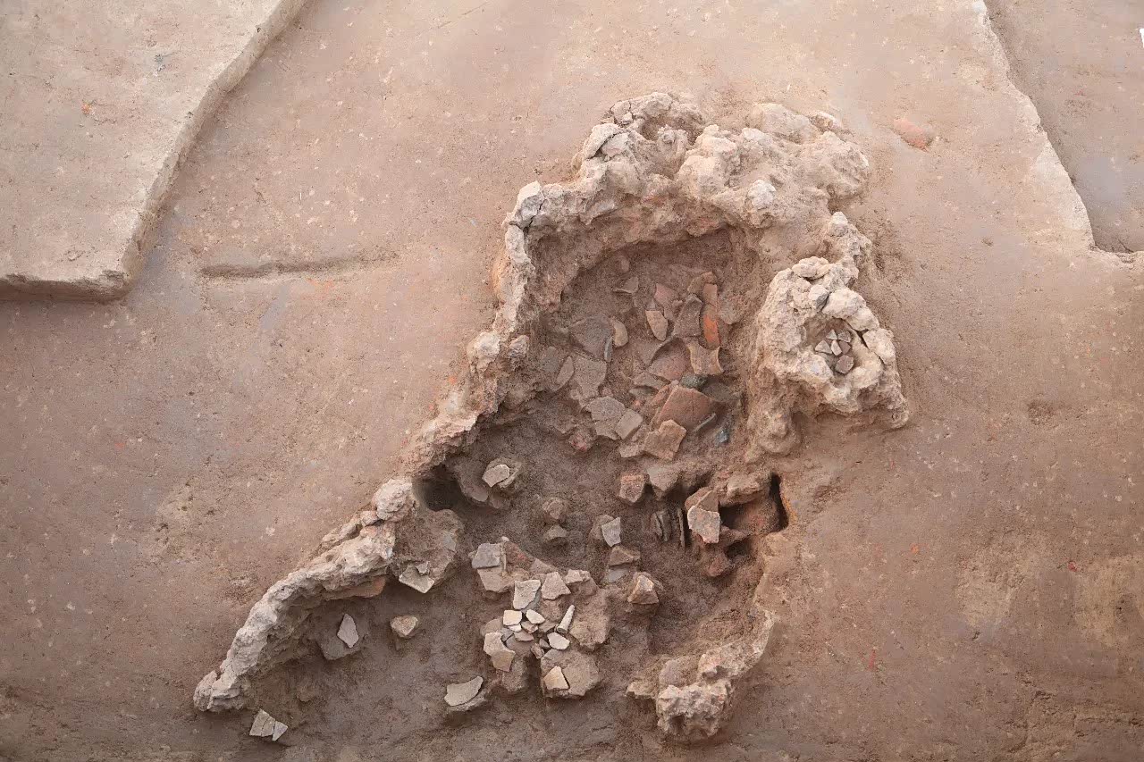 遗址中东部发现的多室建筑F1由三室组成,东室火塘保存较好,底部平整,烧土面清晰,残留炭块、陶片及石块。西室出土较多陶塑制品,房屋周边灰坑分布稀疏,显示该建筑可能具有特殊功能。遗址东南部发现红烧土柱和木骨泥墙墙面遗存,为目前所见年代最早的红烧土房屋证据之一,为研究仰韶时期红烧土建筑的起源提供了重要线索。