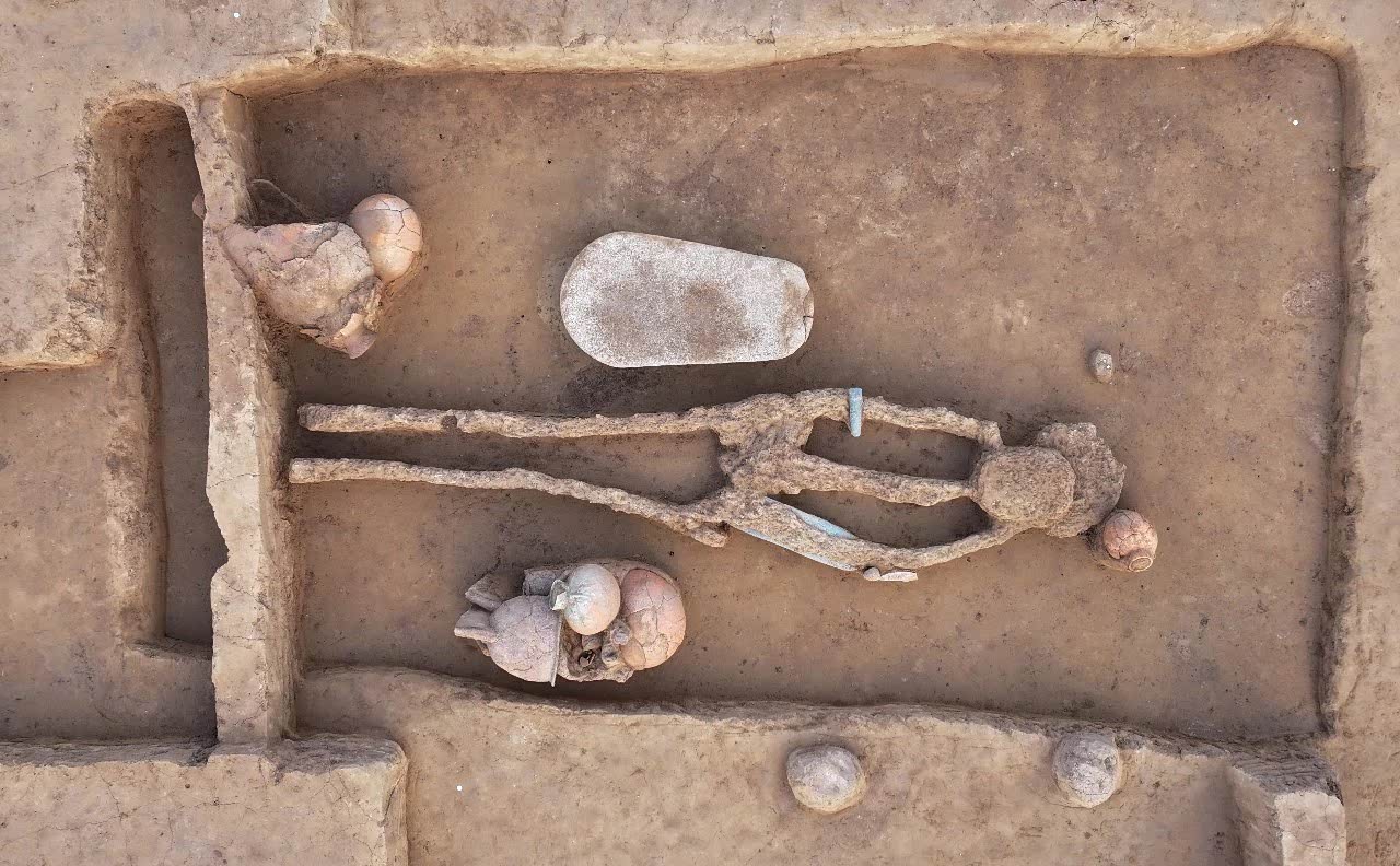 两个墓区尚未完全揭露,其空间关系仍待确认。总体葬式葬俗较为一致,竖穴土坑墓,南向,仰身直肢,陶壶多置于头西侧,已形成稳定的葬俗。西部墓葬核心区墓圹普遍较大,部分墓葬随葬品丰富,壶、深腹罐、三足钵等陶器多成组出土,另一般多见石磨盘、磨棒、陶鼎、绿松石等,反映出一定程度的社会分化。