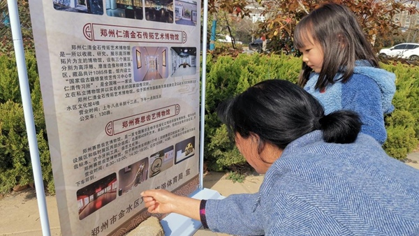 2022年3月7日下午,金水区文化旅游体育局的工作人员来到位于兴达路街道办事处的马渡村社区开展文物宣传,增进广大社区群众对文物保护工作的了解。辖区的郑州仁清金石传拓艺术博物馆和郑州市天中艺术博物馆也参加活动,介绍博物馆展陈特色。