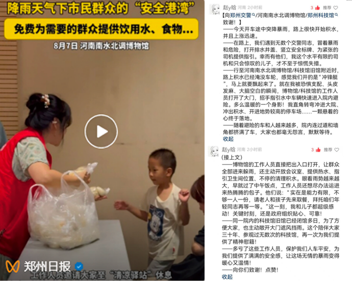 (8月7日河南南水北调博物馆党员志愿者为滞留群众提供物资,获群众好评)